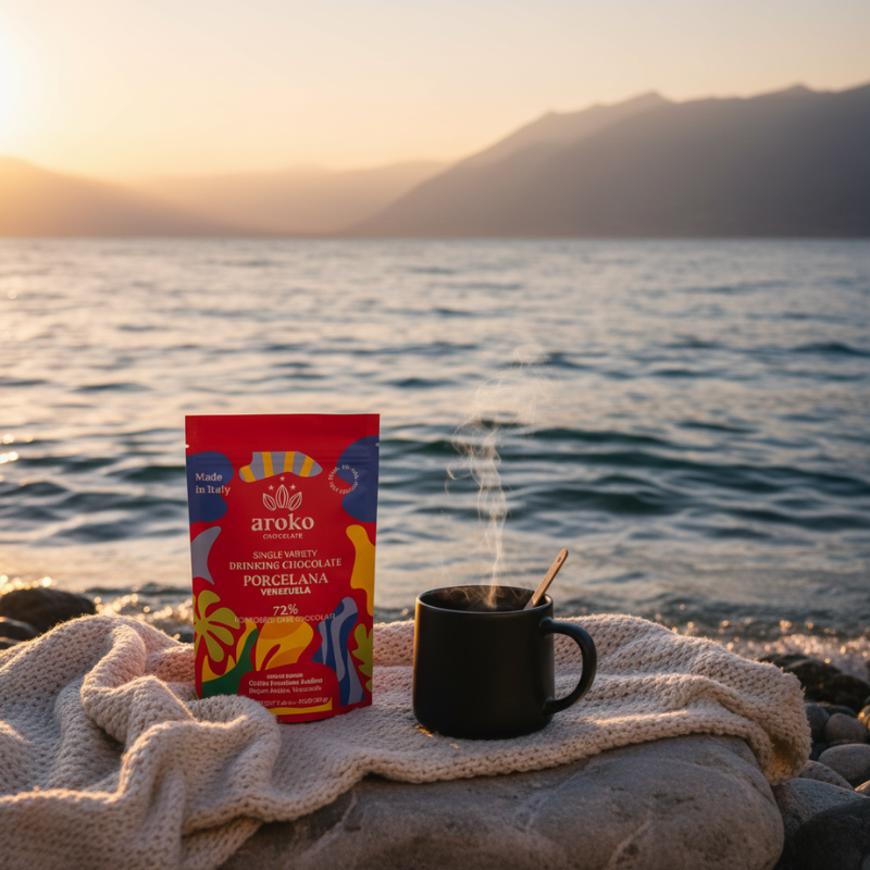 Drinking Chocolate Porcelana 72% 8 porzioni generose per busta Puro cacao criollo con solo zucchero di canna. Grazie all’alta percentuale di burro di cacao regala una texture vellutata e densa, quasi un cioccolato caldo alla italiana. Preparalo con latte intero per il massimo del piacere cremoso. Senza additivi.